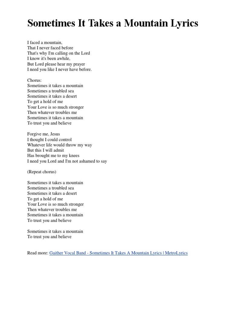 Lyrics Preview Please sign in to see the lyrics preview for this song. Sometimes It Takes a Mountain Lyrics. C F C Sometimes it takes a mountain F Sometimes a troubled sea G Sometimes it takes a desert C To get a hold of me F C Your Love is so much stronger F Then whatever troubles me G Sometimes it takes a mountain C F C To trust.